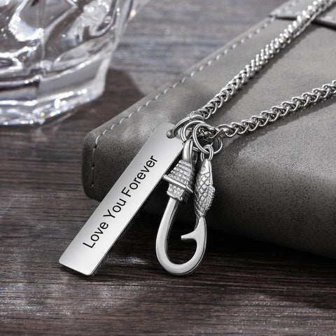 Christmas gift Men Fish Hook Necklace with Engraved Bar Pendant Charm